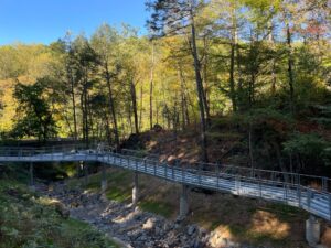 The bridge is made of steel with black locust decking. A lookout of steel grating allows hikers to stand directly over the stream and see the rushing creek beneath their feet. The lookout provides beautiful views of the scenic stream from above as part of the immersive bridge experience.